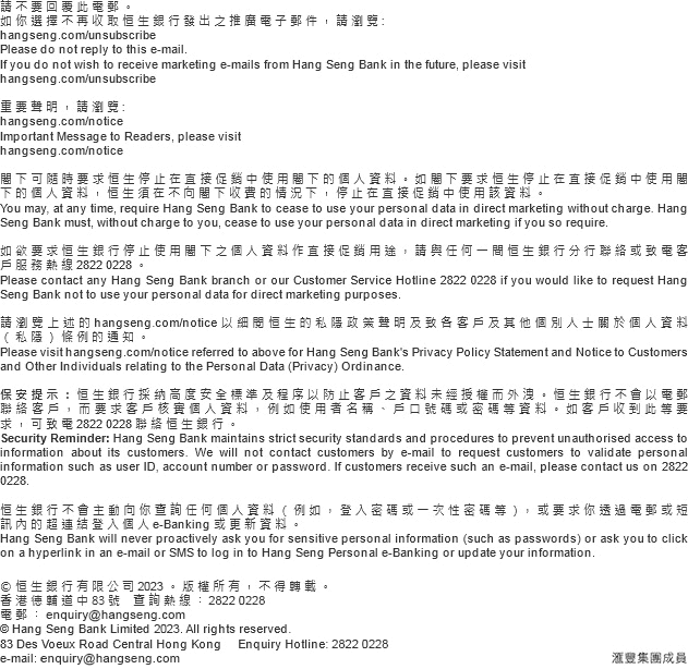| 我們將於未來數月逐步更新相關的網頁、個人e-Banking及恒生Mobile App等,以配合轉換事宜。如有任何查詢,請聯絡你的客戶服務經理或致電24小時理財服務熱線 (852) 2998 8022 (優越私人理財) 或 (852) 2998 9188 (優越理財)。 |