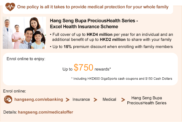 This scheme is underwritten by Bupa (Asia) Limited (‘Bupa’), which is authorised and regulated by the Commissioner of Insurance of the HKSAR. Hang Seng Bank Limited (‘Hang Seng Bank’) is an insurance agent authorised by Bupa for the exclusive distribution of this scheme. Subscription will be payable to Bupa upon enrolment of this scheme. Bupa would provide Hang Seng Bank the relevant commission and performance bonus in accordance to the selling of this scheme. The existing sales staff remuneration policy offered by Hang Seng Bank would take into account various aspects of the staff performance but not solely on the sales amount. HealthPro Concierge Service is provided by Bupa.