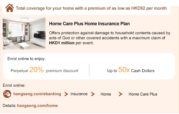 The above general insurance plan ("Plan") is underwritten by QBE General Insurance (Hong Kong) Limited which is authorised and regulated by the Commissioner of Insurance of the HKSAR. Hang Seng Bank is an insurance agent authorised by QBE General Insurance (Hong Kong) Limited for the distribution of this Plan. Premiums will be payable to QBE General Insurance (Hong Kong) Limited upon enrolment of this Plan. QBE General Insurance (Hong Kong) Limited would provide Hang Seng Bank commission and performance bonus accordingly in respect of the selling of this Plan. The existing staff remuneration policy on sales offered by Hang Seng Bank takes into account various aspects of the staff performance instead of focusing solely on the sales amount.