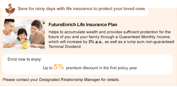 The FutureEnrich Life Insurance Plan is underwritten by Hang Seng Insurance Company Limited ("Hang Seng Insurance"), which is authorised and regulated by the Commissioner of Insurance of the HKSAR. Hang Seng Bank is an insurance agent authorised by "Hang Seng Insurance" and the product is a product of "Hang Seng Insurance", not Hang Seng Bank.