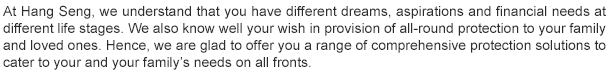 You understand that this Plan is underwritten by "Hang Seng Insurance". You are required to pay premium to "Hang Seng Insurance" for your application for this Plan. The premium includes various fees and charges such as the insurance cost (e.g. cost of the death benefit, which is determined and formulated according to the mortality rate, which in turn is affected by the sex and age of the Life Insured) and policy administration charges, etc. You also understand that "Hang Seng Insurance" will pay commission and sales incentives to "Hang Seng Bank" for marketing this Plan. The current remuneration system that "Hang Seng Bank" adopts is a measurement of the staff’s overall performance rather than a focus on sales production only.