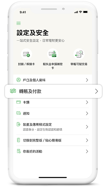 App後於左方選單揀「設定及安全」>「轉賬及付款」>