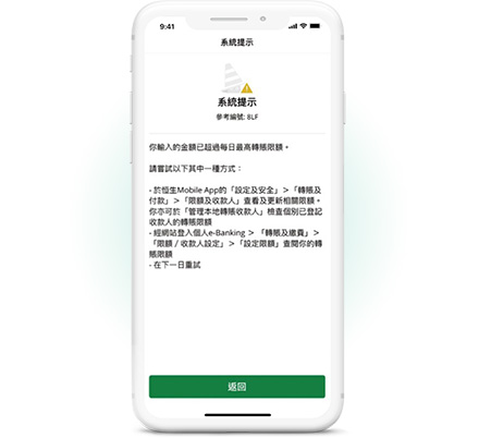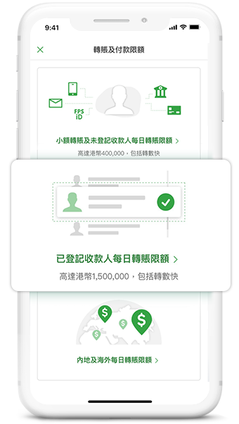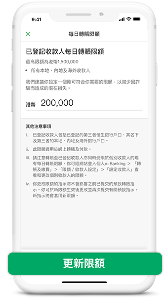 即使已設定「已登記收款人每日轉賬限額」,都有可能因為轉賬金額超出該收款人嘅個別每日轉賬限額而導致無法轉賬。