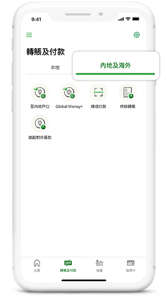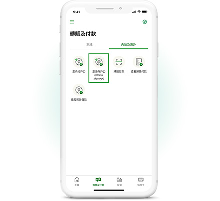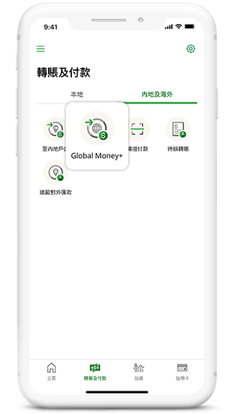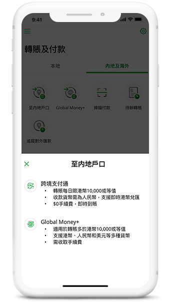 - 如轉賬多於港幣10,000或等值到內地,或需以當地貨幣轉賬到英美澳紐加等50多個指定國家或地區4,則可用Global Money+。
