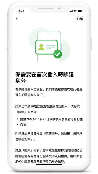 換新機後,想繼續使用網上理財無難度!用香港身份證(2018年11月26日或以後簽發)和自拍即可認證身份,安全快捷地綁定你的新機至恒生Mobile App。完成綁定後,為保障你的戶口安全,你需於App驗證身份以進行高風險交易。