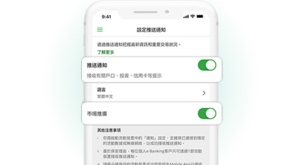 開啟接收推送通知後,即可接收交易通知及戶口最新狀況,包括轉賬、信用卡到期繳款等通知,助你及早發現任何可疑交易或異常戶口活動。