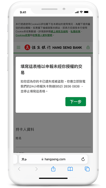 - 如果我們識別到你的裝置有潛在風險(如懷疑有惡意軟件),我們將會暫停在該裝置上使用網上銀行服務