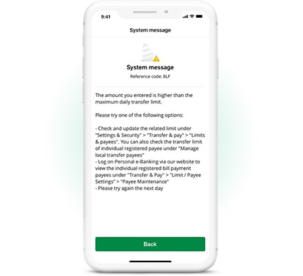When adding a new registered payee, the system defaults their individual daily transfer limit to HKD50,000. Please ensure this individual transfer limit is higher than your actual transfer amount to complete the transaction successfully.