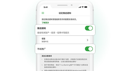 开启接收推送通知后,即可接收交易通知及账户最新状况,包括转账、信用卡到期还款等通知,帮助你及早发现任何可疑交易或异常账户活动。