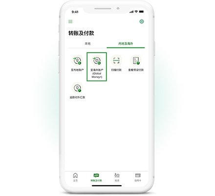 - 如需转账超过港币10,000元或等值至内地,或需以当地货币转账至英国、美国、澳大利亚、新西兰、加拿大等50多个指定国家或地区4,可使用Global Money+。