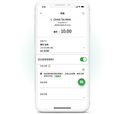 定期转账预设的固定金额至其他户口,例如支付家用、租金等固定支出。