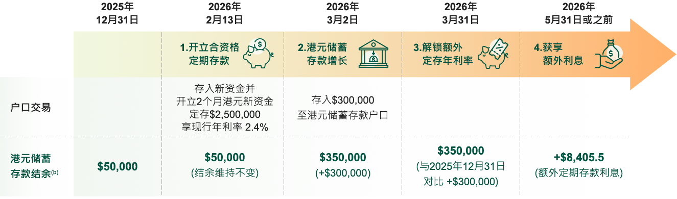 由2026年1月19日至2026年2月28日成功开立2个月港元新资金1定期存款,并于3月份达港元储蓄存款增长,相关定期存款就可享总年利率高达5%2