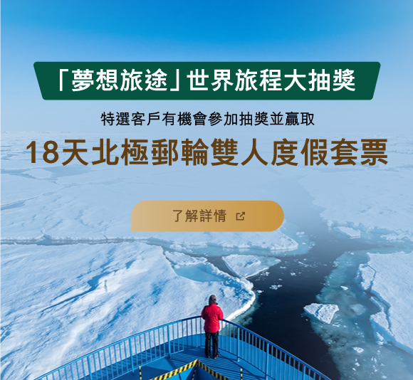 ^優惠推廣期由2026年4月13日至2026年6月30日(包括首尾2日)(「推廣期」)。有關「夢想旅途」世界旅程大抽獎之條款及細則,請按此 。