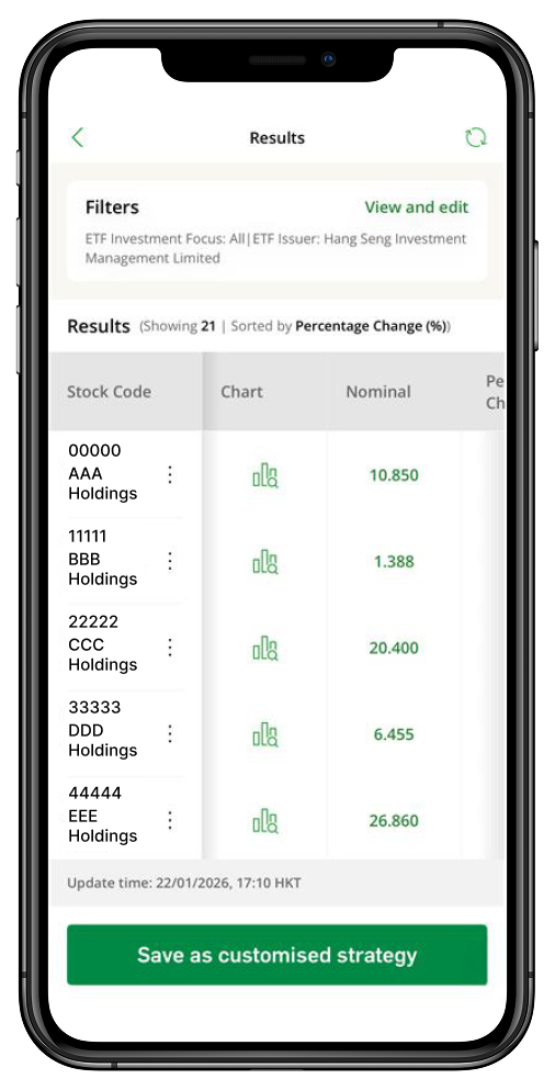 - Flexibly customise criteria based on your investment goals, then identify stocks and save them as your own strategies for regular review.