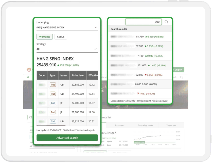 Quickly search for warrants or CBBCs linked to your chosen indices or stocks. Instantly view key data like fund flow, outstanding distribution, implied volatility, and more to help you adjust your investment strategy. -